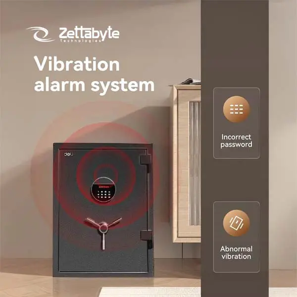 This Deli ET601 digital vault offers advanced security through its vibration alarm system which triggers upon abnormal movements or incorrect password entries The interior provides a spacious storage area measuring 600 x 450 x 400mm while the wide-angle door opening allows for easy access to large documents cash and jewelry throughout the year.
