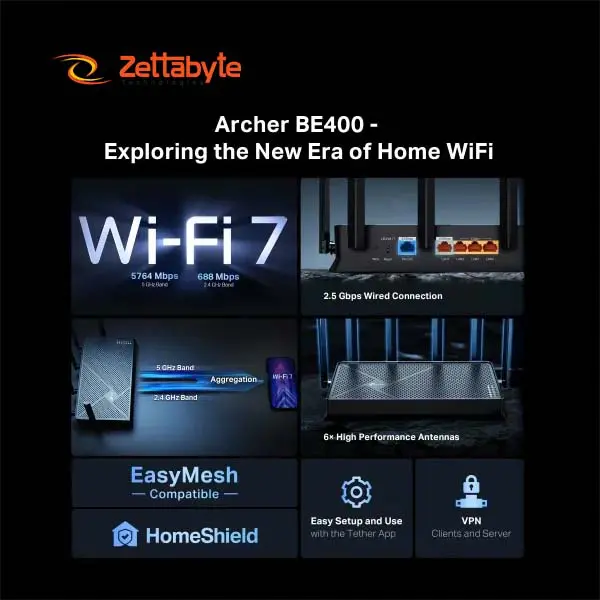 TP-Link Archer BE400 BE6500 Dual Band Gigabit WiFi 7 Router delivers next generation wireless performance with combined speed up to 6500 Mbps including 5764 Mbps on 5 GHz and 688 Mbps on 2.4 GHz It ensures smooth 8K streaming cloud gaming and ultra fast downloads.