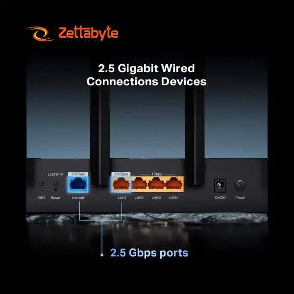 Equipped with 6 high performance external antennas with beamforming 1× 2.5 Gbps LAN and 3× Gigabit LAN ports this router provides wide coverage strong signal WPA3 security and advanced TP Link HomeShield protection for stable networking.